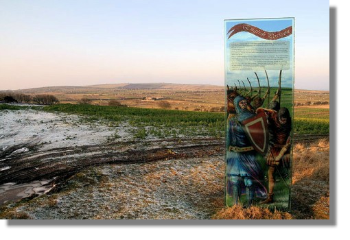 Edward's army was some 8,000 strong and only a small force had been left to guard Berwick. Douglas had by far the larger force with some 14,000 troops. Part of the Berwick agreement had stipulated that the Scottish force had to take battle to the English. Edward had chosen his ground well and deployed his troops on the northern slopes of Halidon Hill with a wide area of marsh to the fore and blocking the routes into the town. Douglas had to advance down Witches Knowe and across an area of marshland in front of the English positions before he could engage. (Graphic from plaque at Halidon Hill © Lisa Jarvis via Wikimedia Commons