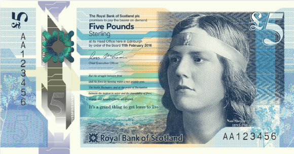 The Royal Bank of Scotland consulted thousands of people across the country in order to develop a series of new notes with relevance to the people of Scotland. This lead to the choice of 'Fabric of Nature' as the theme and the Royal Bank of Scotland Scotland's Board chose Nan Shepherd to feature on this note.