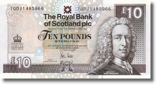 Being the "Royal Bank of Scotland" (established by a Royal charter in 1727) it was appropriate that they should issue a bank note to commemorate the Queen's diamond Jubilee in 2012. The £10 notes are dated 6 February 2012, the 60th anniversary of the accession of Queen Elizabeth II, following the death of her father, King George VI. The two million notes issued all have a serial number beginning "TQDJ" and the front of the note carries the official crown emblem and the words "Diamond Jubilee 1952-2012". Otherwise, most of the front of the note is similar to the usual Royal Bank of Scotland design - with a portrait of Lord Ilay (1682-1761), the bank's first Governor and a representation of the "stars" in the impressive ceiling of the bank's chief office in Edinburgh.
