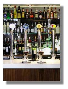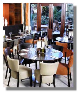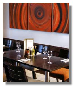 With direct access from the hotel car park or lift from the lobby, enter the L-shaped, split level, interconnecting layout of the bar and restaurant. There are far more seats and tables tucked away around hidden corners than you probably first realise. Relax on the comfortable banquette seating along one wall, or in an intimate booth for two. The bar has been designed for couples, small groups and private dining. To cater for today's working on the move, the bar has free wi-fi connection. For sports fans there are two extra large TV screens and good music which changes with the mood and time of day. Contemporary materials combine leather, stainless steel, stone, timber veneer, tile and glass with bold bright artwork around the walls.