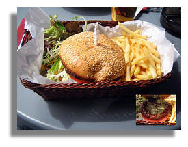 The menu as you might expect, matches the décor with contemporary American -fusion dishes. On a Friday summer evening the bar was pretty packed out with local office workers, visitors and hotel guests enjoying a few drinks or a meal. As the tables were all taken in the main Bar Restaurant, we were invited to go around the corner into Hudson's intimate little café bar. This is where hotel guests have breakfast, coffee and deli snacks served all day, but it doubles as a quiet annexe to the Restaurant for dinner. For starters there's a wide choice of soups, salads, sharing platters, tortilla chips and dips. It all looks very fresh and health-conscious. I began with three tiny, delicious crab and cod fishcakes, green salad with a dash of Arran mustard on the side. My dining partner selected a bowl of Seafood Chowder, which was a generous portion, and crammed full of chunks of tuna, mussels, potatoes with a king prawn sitting on the top. A meal in itself.