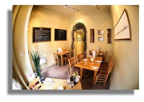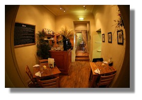 The name Stac Polly comes from the spectacular, craggy, towering mountain Stac Pollaidh, (2,009 ft) north of Ullapool in the North West Highlands. The name means "peak of the peat moss" and it's a must-visit trek for enthusiastic hill walkers. Roger admits he is not a hill climber himself, but loves to go marathon cycle rides for relaxation, even after finishing work the night before at midnight!You don't have to trek far to visit Stac Polly Bistro on St. Mary's Street, an easy walk down the High Street or along the Cowgate. Roger himself is often the Chef in the kitchen. The layout design is divided into two separate rooms (with the kitchen in between), one wee space right inside the door, and another bright and sunny room with patio door overlooking a courtyard. This is "intimate" dining with neatly-spaced, scrubbed country pine tables and chairs, decorated with landscapes paintings and green plants.
