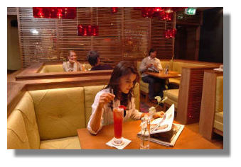 The restaurant (200 covers) has a choice of seating areas divided by partitions, curtains and steel mesh screens to create intimate spaces. There are large round tables for a small group surrounded by silver beaded drapes, square "American diner" tables, and in a glass roofed courtyard is a more formal dining area featuring Bedouin-style booths.