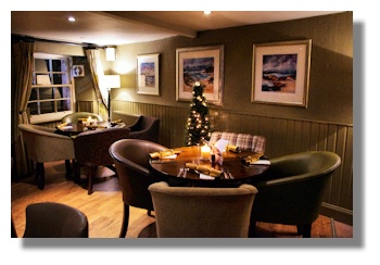 This is a country inn, combining a cosy, welcoming pub atmosphere, soft lighting, rustic charm, polished pine circular tables with candles and comfortable chairs and sofas in a variety of fabric and leather covers. Around the walls are large, modern prints of Scottish scenic views. Out in the front of the Inn are wooden picnic benches (see graphic at the top of this page) for summer time drinks and lunch (when the weather permits).