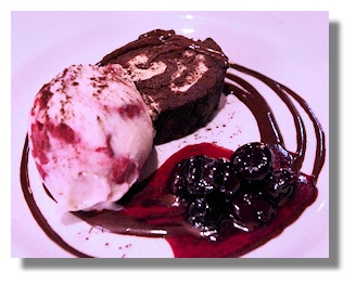 Ah yes - the dessert! It was just as well that I was sticking to the set menu (with "only" four desserts to choose from and not the à la carte (seven choices). I thought that a picture of clootie dumpling with butterscotch sauce and Chantilly cream might be a good choice for readers unfamiliar with Scottish fare, but in the end my taste buds won the day and I went instead for dark chocolate & kirsch roulade, cherry compôte and chocolate sauce, accompanied by cherry ice-cream. You'll notice that the word "chocolate" appears twice in that description. Although I wasn't likely to forget it, I did take a note while enjoying that dessert which said "really, really choclatey!!" And the cherry compôte was delicious too, while the ice cream blended well with the other ingredients.And I must also note that, just as important as the decor and the food, the staff serving in the restaurant were all helpful, welcoming and attentive.