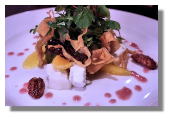 John Milloy, Laurie Newlands and the kitchen staff specialise in creating imaginative menus using seasonal, locally sourced and freshly prepared ingredients. There are two menus - choose from a set menu of two or three courses from 1.30pm until 6.30pm and an à la carte menu in the evening - though there is an overlap between the two. On a cold winter's night I must say I was very tempted by the soup of the day, especially when I heard it was sweet potato, coconut, chilli and ginger - I was thinking of that when I wrote "imaginative menus" above. While I would certainly have liked to try that tasty sounding soup, I always like to take photos to illustrate these reviews - and soup is not (usually) the most photogenic of subjects. So I opted instead for a salad of goats' cheese, figs, pecans, orange, rocket lettuce and shallot dressing. That certainly satisfied the "photogenic" requirement and on taste and texture it was a great choice too. The waitress apologised for the fact that there were no figs - but the parsnip crisps adorning the salad were a more than adequate substitute. Made on the premises they were delightfully light, crisp and tasty.