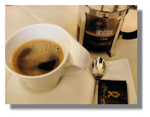 The portions were generous and, accompanied by a dish of Pilau Rice, satisfyingly filling, so we decided to miss the dessert stage (assorted ice-creams, including Kulfi, an almond flavoured variety, and fresh fruits such as mango and lychees) and finished instead with coffee. Normally, I wouldn't think of taking a photo of a cup, but true to that attention to detail (mentioned more than once in this review), even the coffee cups, with their unusual curved handles, caused us to blink. Oh, and the cafetière of coffee tasted good too!