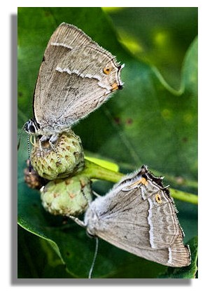 Often seen fluttering around high up in oak trees on warm sunny July and early August days. Males have a glossy purple sheen on the upperside, females have two patches on the forewing only. The underside is light grey with a white streak, edged in black, running down the middle of both wings. The hindwings have a short tail with two orange spots at the base on the underside. It is common and widespread across southern and central England and Wales, becoming rarer and more isolated in the north as far as central Scotland. Males tend to stay high up in trees; females come down to lower levels to lay eggs. Both sexes feed mainly on honeydew although females are occasionally attracted to flowers whilst taking a break from egg laying.Eggs are laid singly at the base of oak buds in late summer ready to hatch the following spring as the buds break. Both Sessile Oak Quercus petraea and Pendunculate Oak Quercus robur, Britain's two native oaks are used and also some introduced species such as Turkey Oak Quercus cerris and Evergreen oak Quercus ilex. In winter the eggs are easily found on close examination of bare branches. The caterpillar is fully developed inside the egg after two or three weeks but doesn't hatch until the spring whereupon it burrows into the flower buds to feed safely concealed. As it gets larger and the buds open it spins a silken retreat and feeds only at night. The caterpillar is dark red-brown and has a darker brown line along its back and paler oblique line along each side. It is very difficult to find due to its resemblance with a brown leaf-flower bud. Pupation usually takes place in the leaf litter where it is tended by ants who bury them, but also sometimes in a crevice in the bark of the foodplant. There is one brood a year with adults on the wing in July and August.