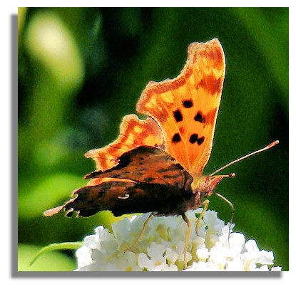 The Comma's scalloped, ragged wings with black marks on an orange-black background make it a most attractive butterfly. The underside of the wings, however, are dark brown, with the distinctive, white, comma-shaped marking standing out (see graphic on the right). The brown underside provides camouflage for hibernating as the wings look like dried leaves when folded.