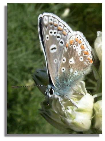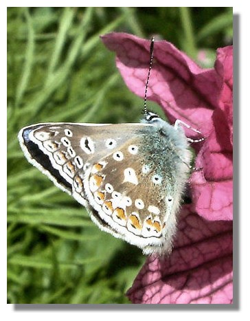 The Common Blue favours lowland grassland habitats, particularly in coastal areas and disturbed waste ground in urban locations. As a result, colonies can be lost when such sites are developed for housing etc. The metallic blue colour of the male is not due to pigment but to diffraction of sunlight by thousands of corrugated scales on the wings that absorb all colours of the spectrum except blue.