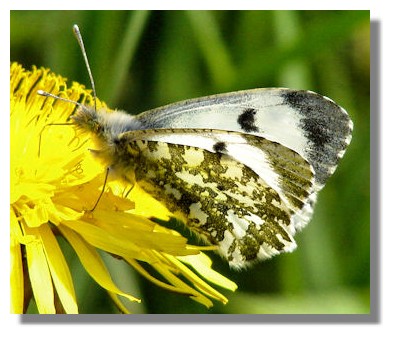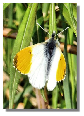 The male of this medium sized butterfly is easily recognised by the distinctive, vivid orange tips to the top of its otherwise white forewing - looking almost as if its wings had been dipped in orange paint. There is also a dark spot close to where the orange and white colouring meet. The undersides of the wings, on the other hand, are mottled green and white, creating a superb camouflage when settled on flowerheads such as Cow Parsley and Garlic Mustard. Looked at closely, the green colour is in fact made up of a mixture of black and yellow scales. The male is able to hide his orange tips by tucking the forewings behind the hindwings at rest. The Orange Tip is found across Europe, and eastwards into temperate Asia as far as Japan. Over the past 25/30 years there has been a rapid increase in the range of the Orange Tip in the UK - particularly in Scotland. It is now found in many parts of Scotland, as far north as Moray, flying along hedgerows and damp meadows, damp pastures and meadows, damp woodland edges and glades, riverbanks, ditches, dykes, fens, railway cuttings and country lanes.The Orange Tip is usually seen in damp grassy habitats where Cuckooflower (also known as Lady's Smock) the primary larvae foodplant grows and along hedgerows where Garlic or Hedge Mustard is found.