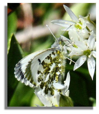 The more reclusive female Orange Tip lacks the orange marking, having black wing tips instead and is often mistaken for one of the other 'White' butterflies. However, it has a mottled green and white underside similar to the male. See graphics above and to the left.The female lays eggs singly on the flowerheads of Cuckooflower and Garlic Mustard and many other species of wild Crucifers. Because the larvae feed almost exclusively on the flowers and developing seedpods there is rarely enough food to support more than one larva per plant. Indeed, the larvae may eat up to 6 Garlic Mustard seed pods in a day, pausing every so often to rest. If two larvae meet, one will often be eaten by the other to eliminate its competitor. Newly hatched larvae will also eat unhatched eggs for the same reason. To stop eggs from being laid on plants already laid on, the female leaves a pheromone to deter future females from laying. Pupation occurs in early summer (June/July) in scrubby vegetation near the foodplant, where they stay to emerge the following spring. Adult Orange-tip butterflies are on the wing between mid-April and mid-June