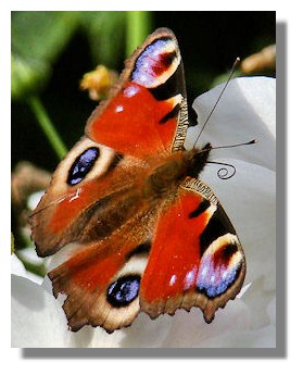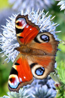 The European Peacock butterfly (Inachis io), is a well-known colourful butterfly, found in temperate Europe and Asia. It should not be confused or classified with the "American peacocks" in the genus Anartia; these are not close relatives of the present species.The Peacock has red wings with black markings and distinctive eyespots on tips of fore and hind wings. The Peacock's spectacular pattern of eyespots, evolved to startle or confuse predators, make it one of the most easily recognized and best known species. It is from these wing markings that the butterfly gained its common name. The Peacock can be found in woods, fields, meadows, pastures, parks, and gardens, and from lowlands up to 8,200 feet (2,500 m). It is a relatively common butterfly seen in many European parks and gardens.