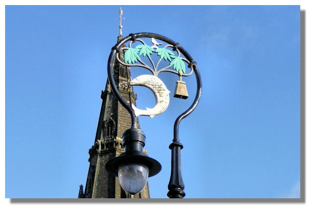 Motifs From Glasgow Coat of Arms, with Glasgow Cathedral Behind