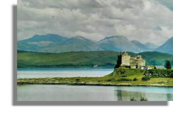 Duart Castle is on a rocky headland - "Dubh Ard"or "Dark Headland" on the Isle of Mull, off the west coast of Scotland and dates back to the 13th century. The graphic on the right of Duart Castle across Duart Bay is via Wikimedia Commons.