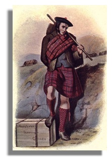 The graphic on the right is a Victorian romantic depiction of a MacAlister clansman illustrated by R. R. McIan, from James Logan's The Clans of the Scottish Highlands, 1845.