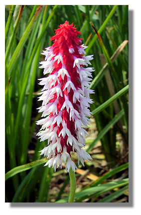 This unusual and striking flower is called "Primula Vialii". Many primulas tend to bloom in spring but this variety is summer flowering. It is easily grown, but is short lived.