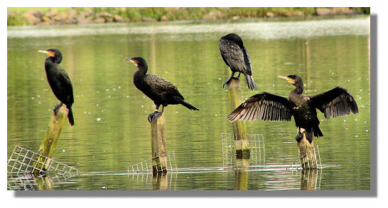 The cormorants in this picture can often be seen feeding on the fish in Lochend Loch in Drumpellier Country Park in North Lanarkshire. The stretching of the wings by the bird on the right is a typical pose and it can sit like that for a long time - possibly drying out its wings after diving for its lunch?If you want to look back at earlier editions of this Colour Supplement, there is an Index Page