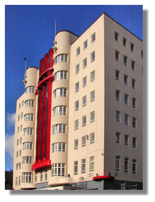 The refurbishment of the art-deco 1930s Beresford Hotel is nearing completion. It was built for the Empire Exhibition in Glasgow in 1938 and the facade was created like a cinema to attract customers. After the war, while operating as Baird Hall, a students' hall of residence, the colours became more muted. But the recent reincarnation has seen the return if the scarlet and black fins and flagpoles at the top of the bulbous drum towers.