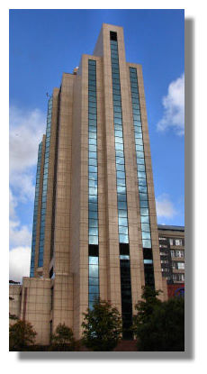 The narrowness of the Glasgow Hilton Hotel makes it look taller than it really is - at 70 metres, it is slightly smaller than the City Chambers (see photo above). The hotel was built in 1992, beside the approach ramp to the Kingston Bridge.
