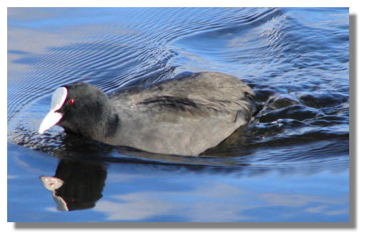 This Coot has a demented look in its eye, though as it has not ruffled up its rear feathers in the "threat" position, it is probably not driving off a rival, but just moving fast to get some of the bread being thrown to the birds by the humans visiting the loch.