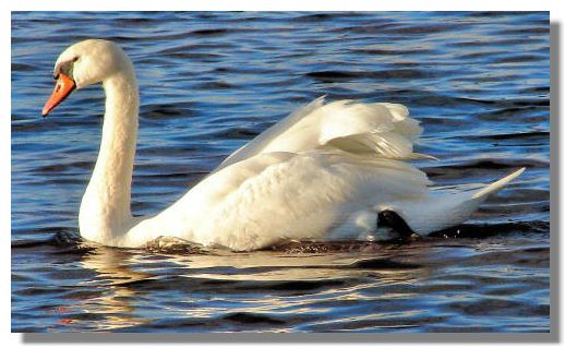 The resident Mute Swans, with their orange bills, are mainly silent (unlike the Whoopers), though they can hiss when angry. Unlike most other birds, the heavy-weight swan cannot take off vertically and has to run along the surface of the water to get airborne. It can only do that on water - land would be too hard on their feet.
