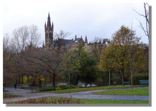 This bleak view of the University of Glasgow from Kelvingrove Park was taken on Monday when there were not only frequent showers, but also a strong, cold wind. Many of the trees have lost their leaves by now - the surprise is that so many are still left.