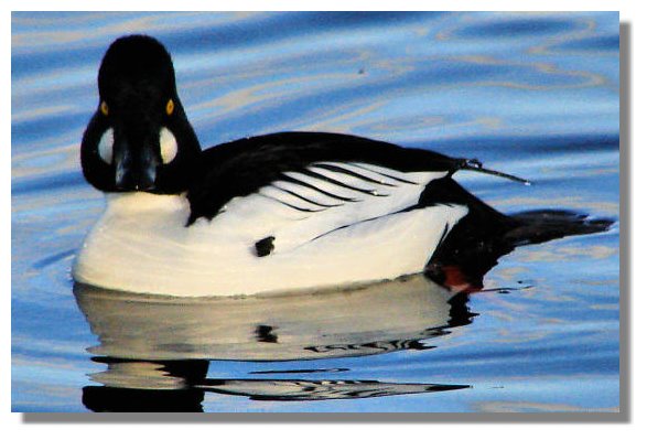 The problem with photographing wild birds is that they don't pose for the camera. I had been trying to get a side view of the lovely black and white markings (and white head spot) of this Goldeneye. Just as the shutter opened, it turned to face me - and produced this much more "interesting" shot!