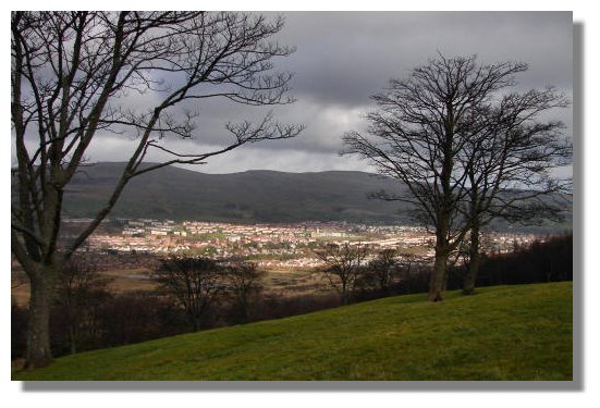 While visiting the remains of a Roman camp beside the line of the Antonine Wall at Barr Hill in North Lanarkshire, the sun came out for a few minutes to light up the small town of Kilsyth, nestling below the hills in the distance. In 1645, the Marquis of Montrose was successful in a battle at Kilsyth against the Covenanters.