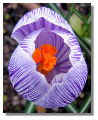 This purple and white striped crocus has been above ground for some time, but it needed a bit of warmth and sun to make the petals open up to make the orange stamens visible. This crocus has been producing its bright, cheerful blooms every year for nearly twenty years in my own garden.