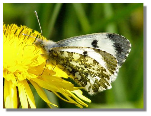 As is often the case in nature, the female Orange Tip is not nearly as colourful as the male. The upper side of her wings look just like the more common Small White butterfly. In fact, this is the first picture I have ever managed to take of a female Orange Tip. They are usually flitting rapidly along hedgerows, road verges, and woodland edges. The mottled pattern on the underside hindwings provides excellent camouflage when they roost on flower heads.