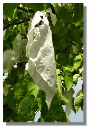 The Handkerchief Tree is easy to recognise as long as its unusual flowers are visible. The correct botanical name is "Davidia" and it is also known as the Chinese dove tree. Since seedlings can take 10-20 years to flower, new plants are often created by layering low-growing branches in the ground so that they take root.