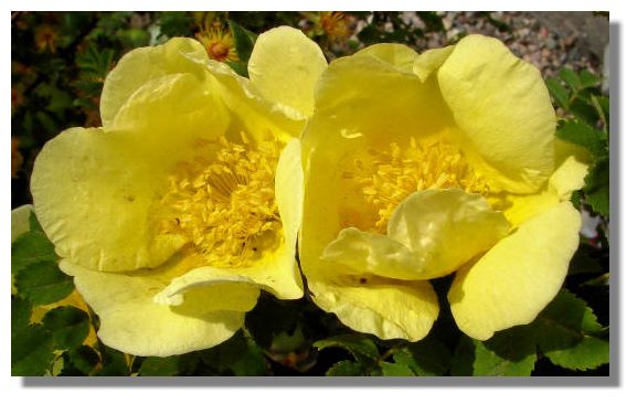 The flowers of the Potentilla shrub resemble small, wild roses, and the abundant blooms last through the summer. The flowers are only about an inch across.