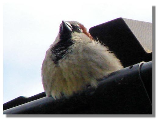 It was the loud cheeping that drew our attention to this fluffy, baby sparrow, waiting impatiently to be fed on the roof of the Glendoick Garden Centre!