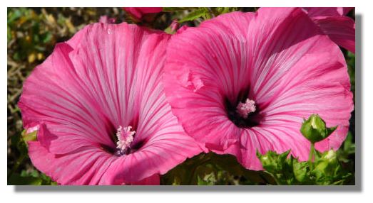 Here's a real sign of summer - the large, colourful trumpets of Lavatera - the tree mallow. These showy flowers come in all sorts of varieties of different colours and are valued for their profusion of large flowers - they can be several inches across.
