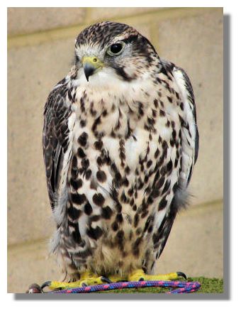 Another bird of prey on display outside the Borders bookshop was this fine hybrid falcon, half Peregrine Falcon and half Saker Falcon. Hybrids are bred in the hope that the qualities of both birds will be brought out in the young. The Peregrine Falcon is the fastest bird on earth, reaching speeds of 200mph in a dive. The Saker Falcon is a very large species of falcon. By combining the two, the hope is that both the size and speed valued in each of the pure blooded parents will combine.If you want to look back at earlier editions of this Colour Supplement, there is an Index Page