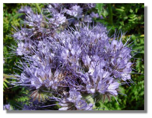 This is a close-up of the purple flowers of Phacelia. It is one of the top 20 honey-producing flowers for honeybees and is also highly attractive to bumblebees and hover flies. It is usually ploughed into the ground at the end of the season and is beneficial for following vigorous cash crops such as potatoes.