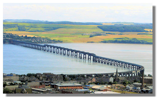 The original Tay Rail Bridge, slightly up-river from the road crossing, was completed in early 1878. At the time, it was among the longest in the world, but during a violent storm on the evening of 28 December 1879, the centre section of the bridge collapsed, taking with it a train that was running on its single track. More than 75 lives were lost. The replacement seen here was opened on 13 July 1887. Even at high tide, the supports for the old bridge can be seen near the present structure - a constant reminder of the earlier tragedy.