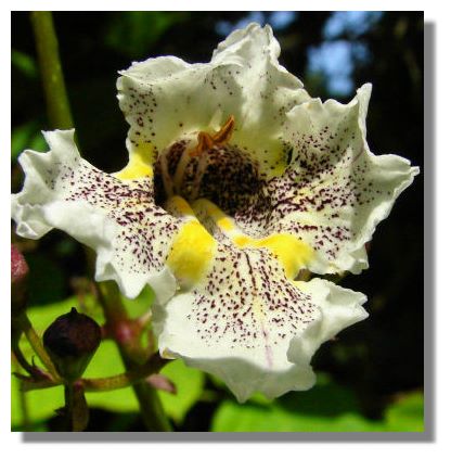 Southern Catalpa (Catalpa bignonioides) is a species of Catalpa, native to the south-eastern United States in Alabama, Florida, Georgia, Louisiana, and Mississippi. It is also sometimes known as Indian Bean Tree. A single flower when fully expanded is two inches long and an inch and a half wide. This example was photographed in the one of the gardens at Culzean Castle Country Park in Ayrshire.