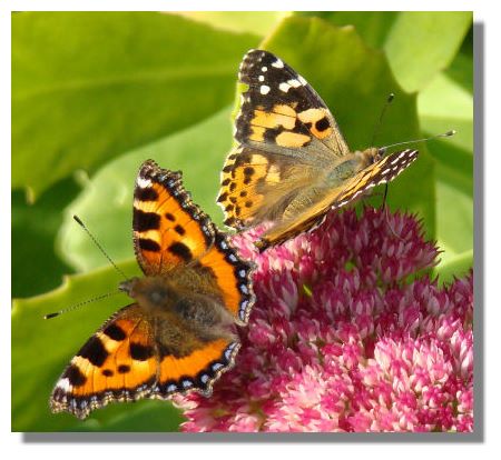Over the summer, there has been a marked absence of butterflies. So it was great to find large numbers of them feeding voraciously on the Sedum "Autumn Joy" in the gardens of Drummond Castle. Although there was a certain amount of wing flicking to scare off bees and wasps, this Painted Lady and Small Tortoiseshell seemed to tolerate one another as they enjoyed the nectar and the warmth of the sun. Sadly, none of the Painted Ladies will survive a Scottish winter but the Small Tortoiseshell may manage to hibernate in sheds or barns.