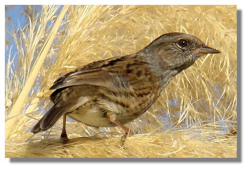 This Dunnock is normally a ground feeder but the seeds of the tall Pampas Grass proved to be a great attraction.