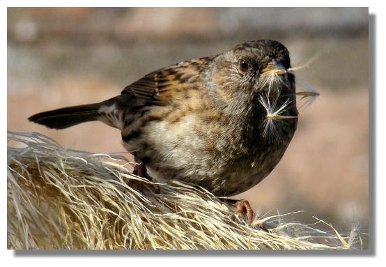 Although the picture above is technically better than this one, I couldn't resist including this incongruous picture of another Dunnock, with the seeds from the Pampas Grass coming out of its beak. It almost looks guilty at being "caught in the act"!