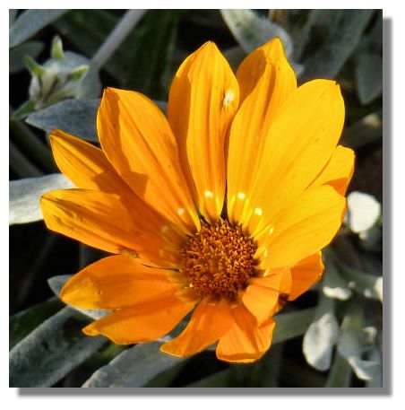 Gazania (also known as "Treasure Flower") are natives of South Africa and the blooms only open out when there is sun or at least very bright conditions. Like the osteospermum above, they have a long flowering season, from mid summer to autumn. Their bright colours are often enhanced by grey or silvery foliage.
