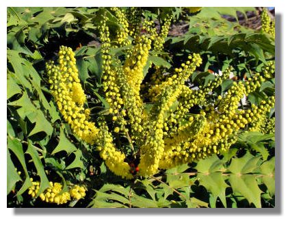 Mahonia shrubs are one of the few garden plants to come into bloom in Scotland in the late autumn or even in the winter. The long spikes of small yellow flowers are often sweetly scented and afterwards there are small, grape-like berries. The leaves on some mahonia also turn bright red, not necessarily in the autumn.