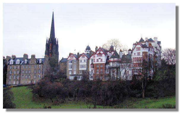 To the left of the castle (looked at from Princes Street below) and adjoining the castle's forecourt or esplanade, are the elegant houses of Ramsay Gardens. The delightful jumble of different architectural styles was conceived in the 18th century, with 19th century additions. The development takes its name from Allan Ramsay Snr, who started out as a wig-maker but became a poet and bibliophile. His "Goose-pie" house is an octagonal shape while the flat created by Sir Patrick Geddes, the father of town planning, has a 360-degree panoramic view.