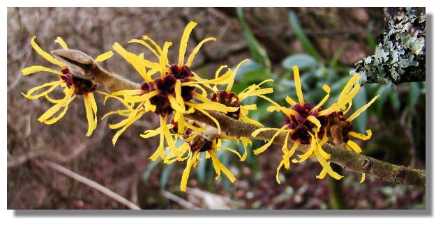 The glowing yellow strands of the Hamamelis (Witch Hazel) flowers, with their crinkly petals, shine out on the leafless branches from early winter to early spring. They survive even the harshest frosts and also have a slight fragrance.