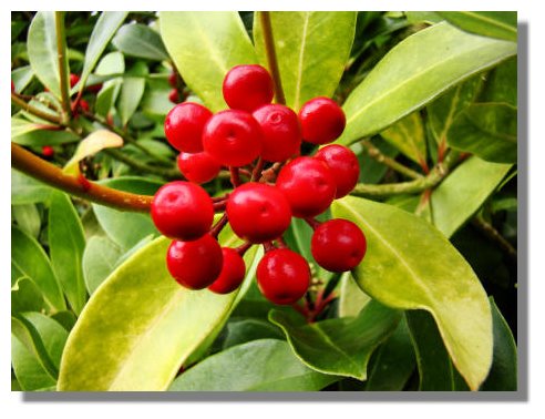 Last week's colour supplement had a photo of a recently planted Skimmia Japonica in flower (surrounded by hailstones). This week, we have here the berries of another variety of Skimmia, grown more for its bright red berries which last through the winter.