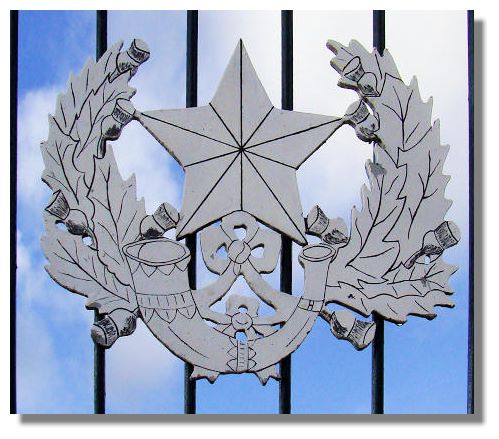 In the parkland of Douglas Castle is a memorial to the Cameronian Regiment - that's a representation of their cap badge photographed on the memorial gate. Cameronian was a name given to a section of the Scottish Covenanters who followed the teachings of Richard Cameron in the late 17th century. The Cameronians (Scottish Rifles) was a regiment directly descended from a unit named the Cameronian guard, which was first raised on 14th May 1689 by James Douglas, Earl of Angus, only a mile from Douglas Castle. The memorial was erected by Lanarkshire County Council in token of its high regard for the distinguished services of the county regiment during nearly three centuries. The Cameronians were disbanded "on the orders of the government" (as the memorial puts it) on 14 May 1968.