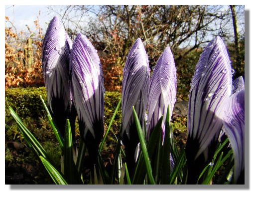 The purple stripes of these crocuses are covered in raindrops after a heavy shower. They have been coming up with unfailing regularity each year in my own garden, but this is the first time I've seen such a straight line of flowers!If you want to look back at earlier editions of this Colour Supplement, there is an Index Page