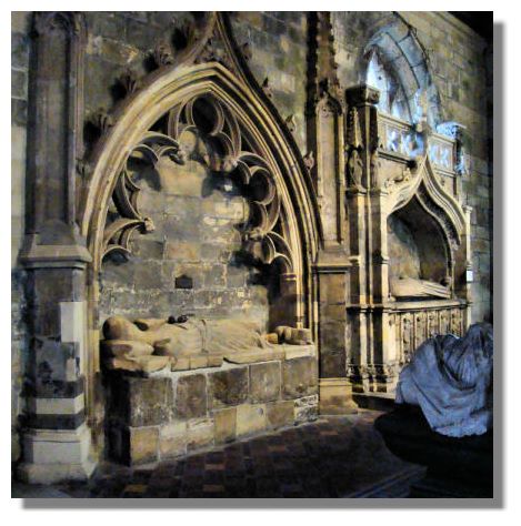 Others buried here include Archibald Douglas, the 5th Earl Douglas, who was also the 2nd Duke of Touraine (France) and a Marshall of France, showing the wide influence of the Douglas line. He died in 1438 - his tomb can be seen to the right of the picture above. The 7th Earl, James Douglas "the Gross" who died in 1443 also has a tomb in the chapel. Unusually for Scotland, his wife Beatrice Sinclair is also interred beside him, their statues lying side by side.
